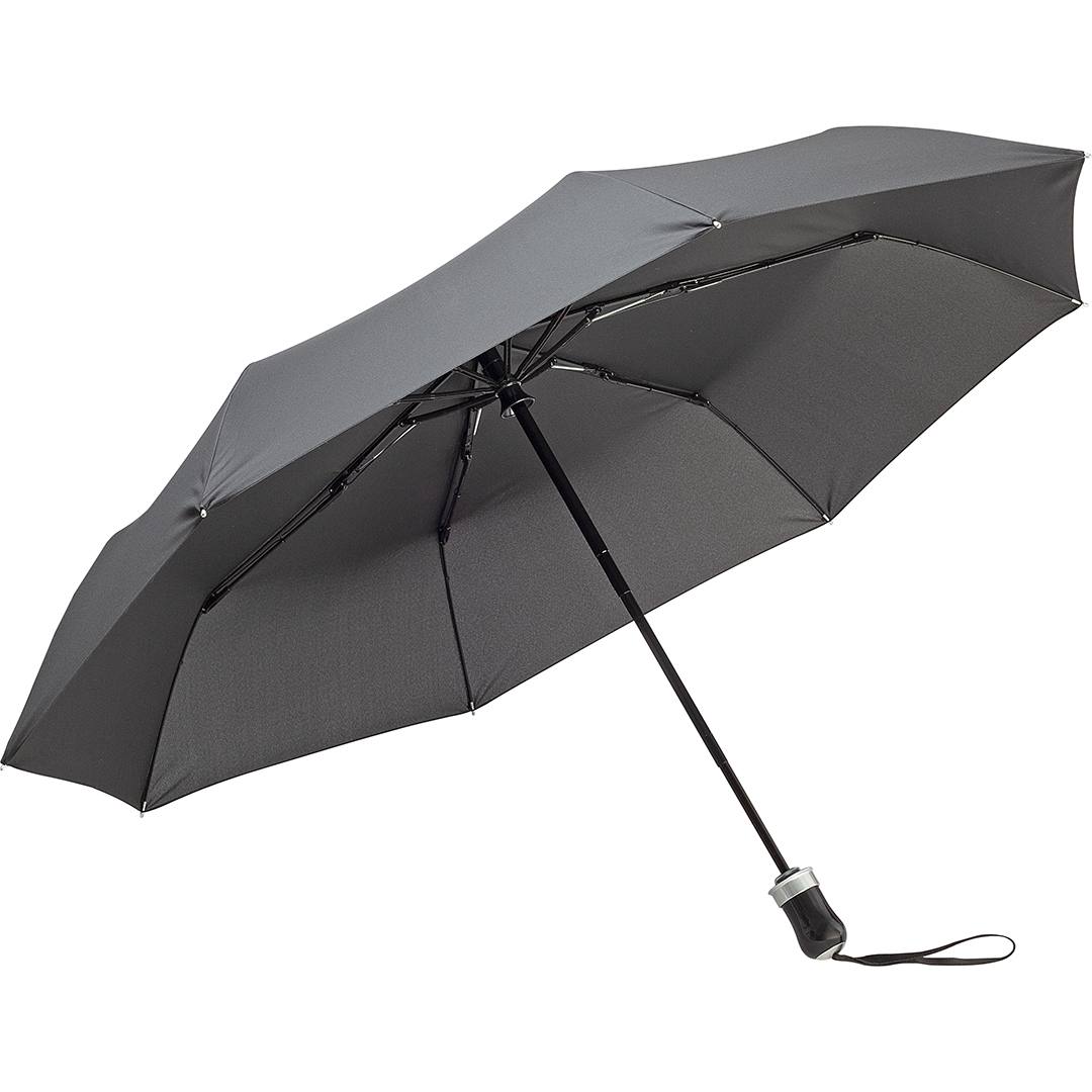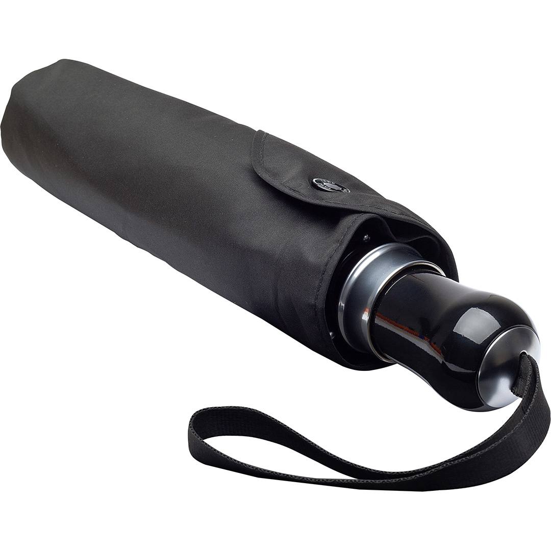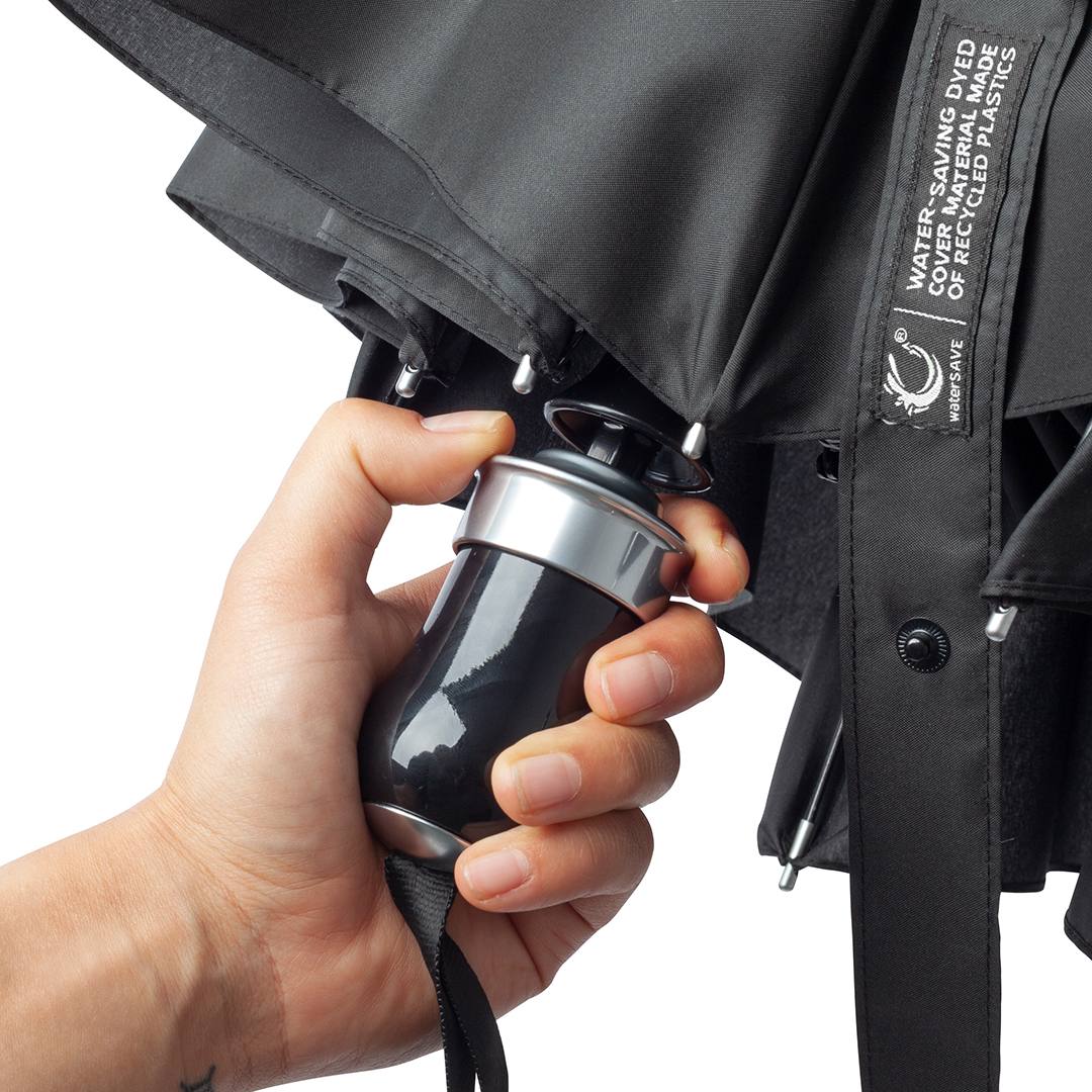 Convenient automatic open/close function for quick opening and closing by pulling down the ring, high-quality Windproof PLUS system for maximum frame flexibility in stormy conditions, polyester pongee material made of recycled plastics, eco-friendly thanks to original waterSAVE® cover material, with waterSAVE® label on the closing strap, silver coloured metal tips, handle high-gloss black with chrome applications and woven carrying loop, closing strap and sleeve with noble push button