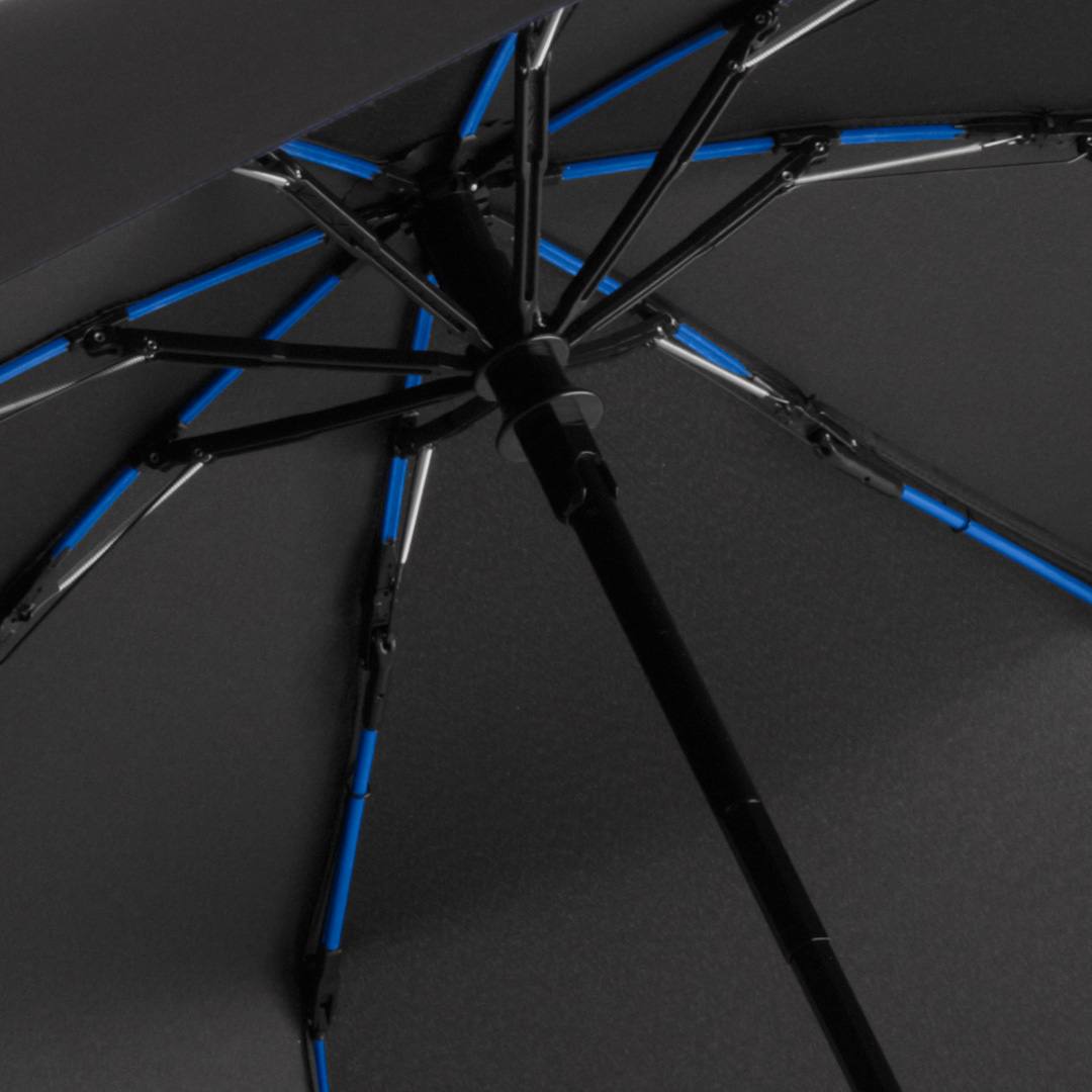 Convenient automatic open/close function for quick opening and closing, high quality windproof system for maximum frame flexibility in stormy conditions, flexible fibreglass ribs, STANDARD 100 by OEKO-TEX® certified polyester pongee material made of recycled plastics, eco-friendly thanks to original waterSAVE cover material made of recycled plastics, with waterSAVE® label on the closing strap (with new deliveries), attractive design thanks to coloured ribs, handle rings and seams, comfortable Soft-Touch handle with integrated push-button and promotional labelling option, convenient case with coloured seams and carrying straps. Also available as mini umbrella (art. 5084, 5584), midsize umbrella (art. 4784) and golf umbrella (art. 2384).