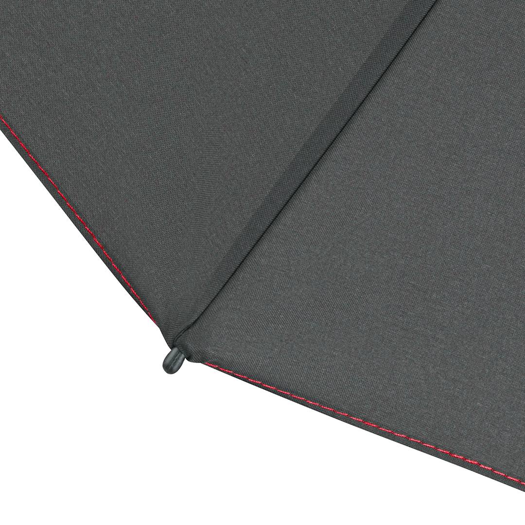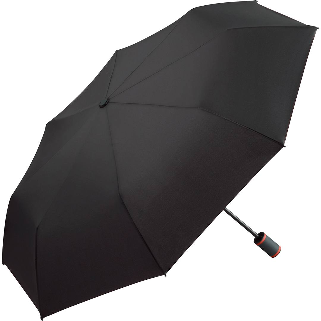 Easy handling due to safety runner, high quality windproof system for maximum frame flexibility in stormy conditions, flexible fibreglass ribs, STANDARD 100 by OEKO-TEX® certified polyester pongee material made of recycled plastics, eco-friendly thanks to original waterSAVE cover material, with waterSAVE® label on the closing strap (with new deliveries), attractive design thanks to coloured ribs, handle rings and seams, Soft-Touch handle with promotional labelling option, sleeve with coloured seam. Also available as mini umbrella (art. 5484, 5584), midsize umbrella (art. 4784) and as golf umbrella (art. 2384).