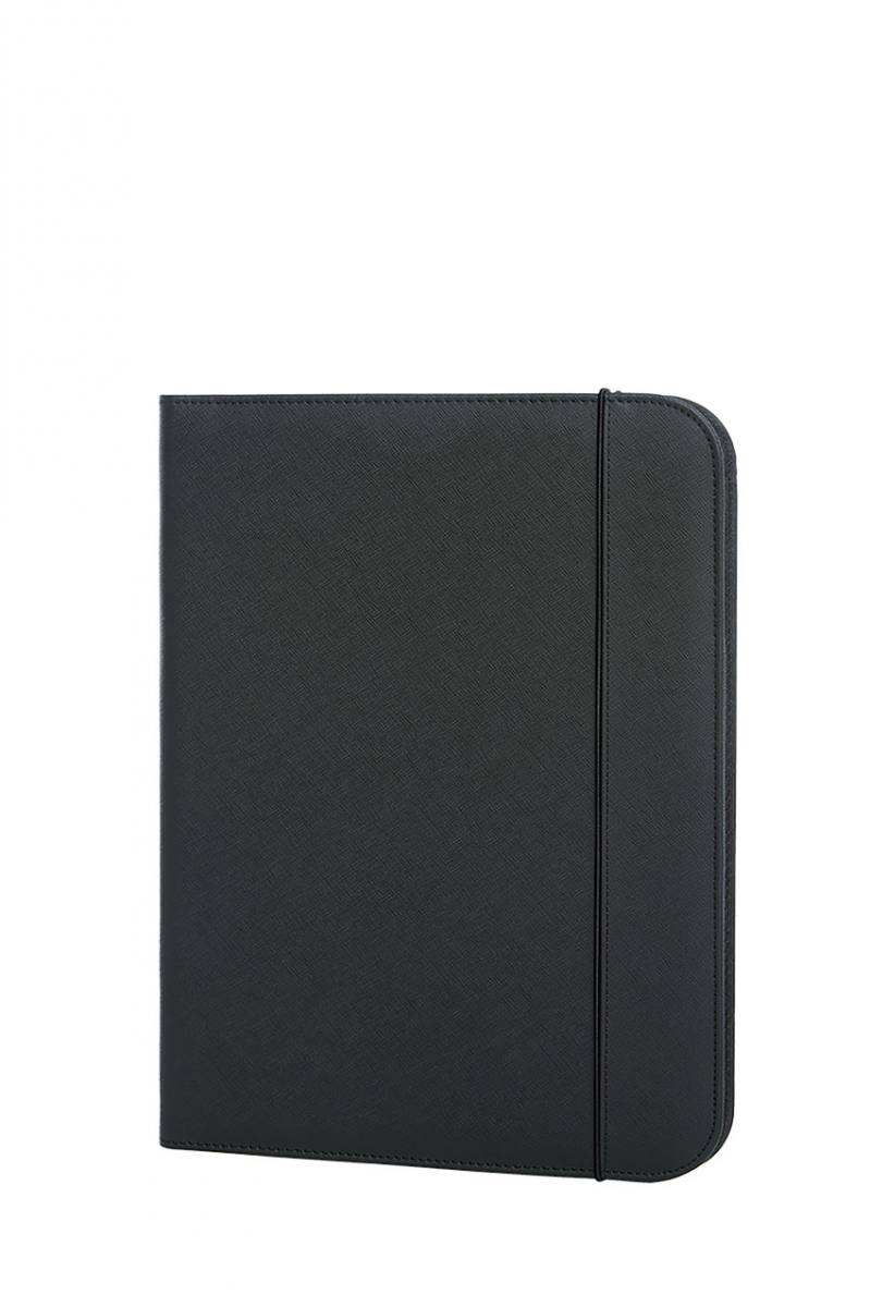 black conference folder with organizer features; closes with colored elastic band; writing pad; flat insert pocket; elastic band for pens