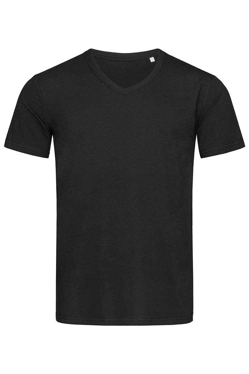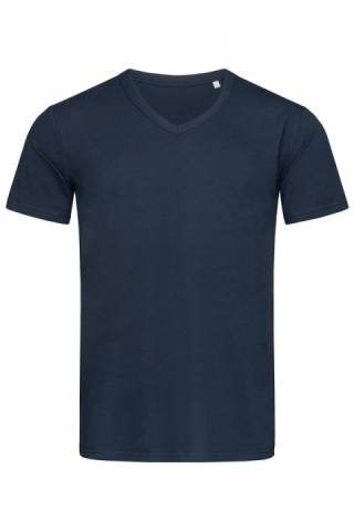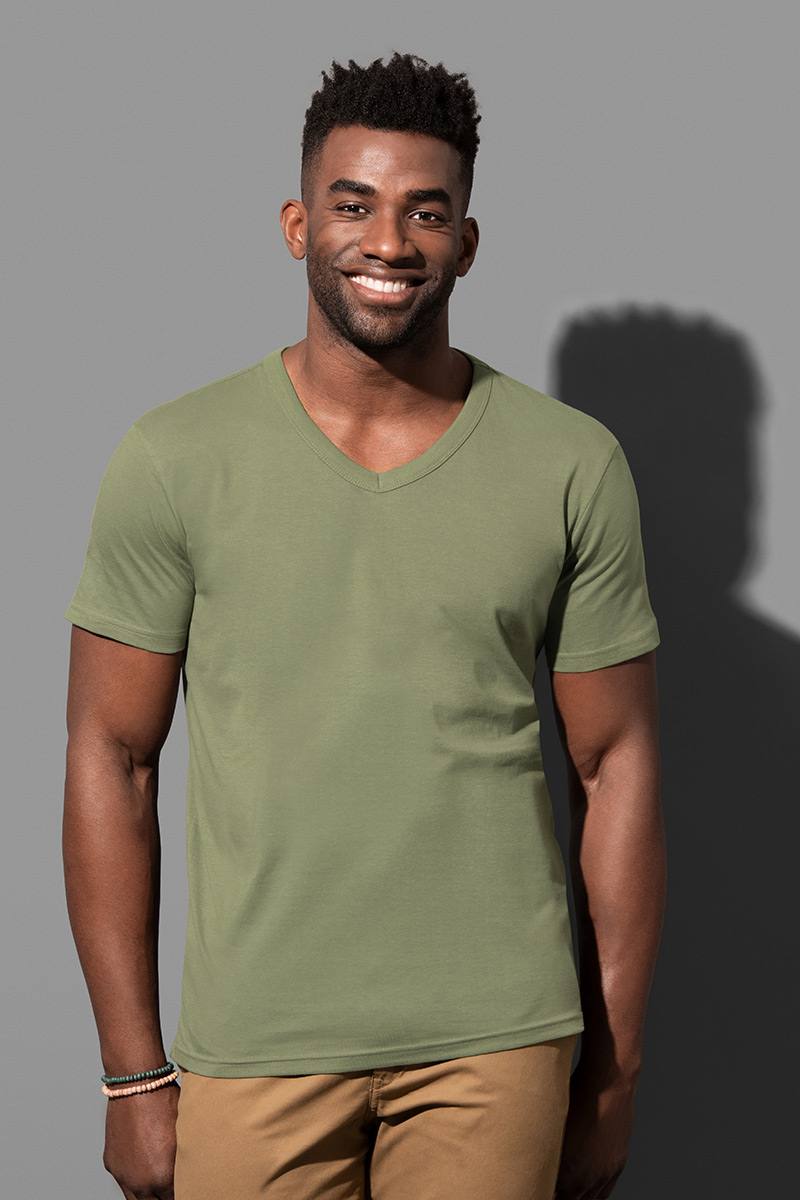 Classic cut V-neck T-shirt for men features collar with rib binding and made of durable single jersey cotton.