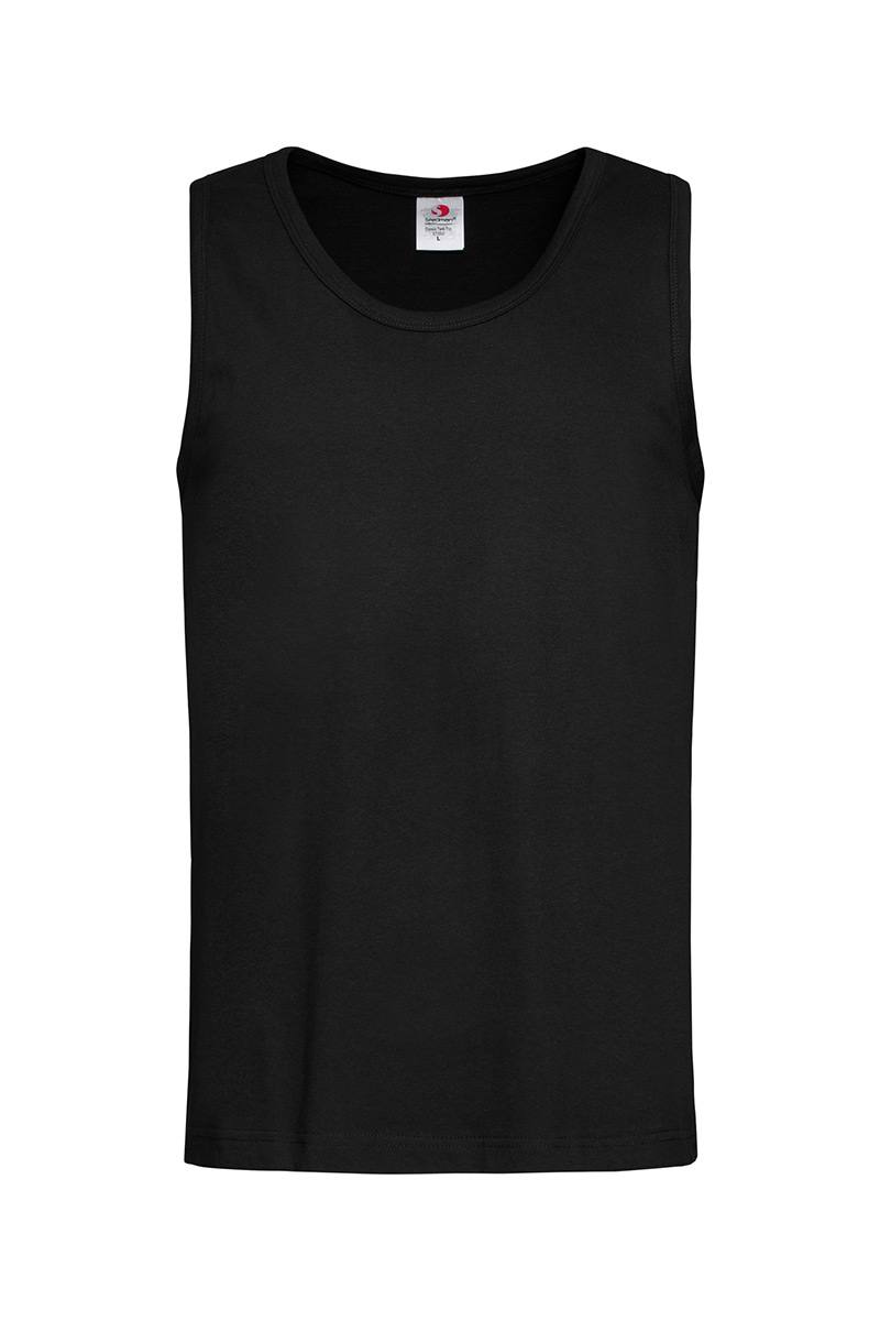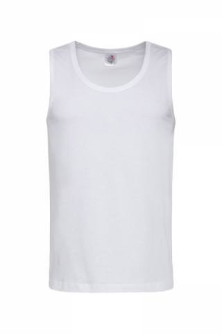 Soft tank top for men, without side seams, collar and arm holes with binding and made of durable single jersey cotton.