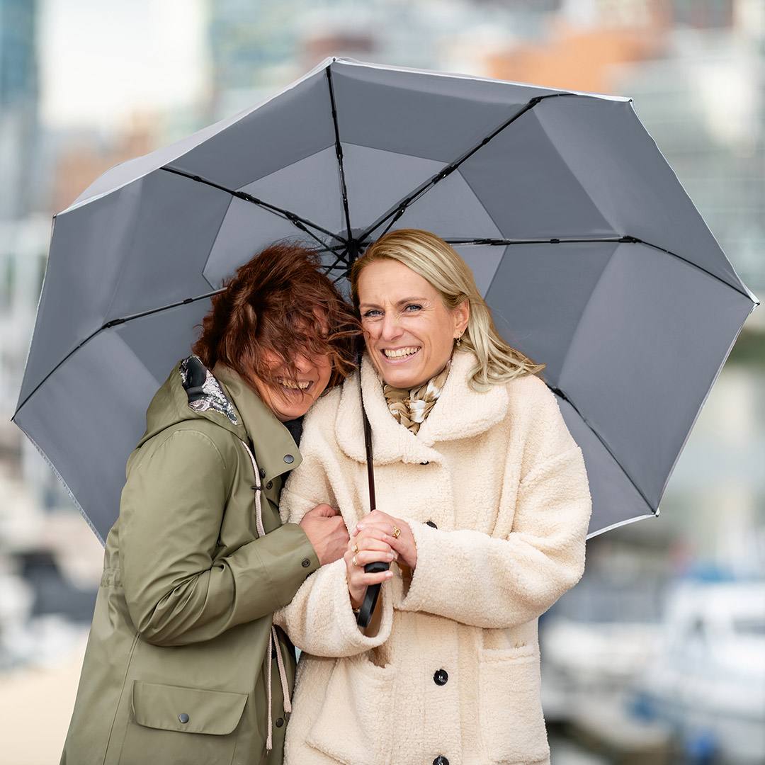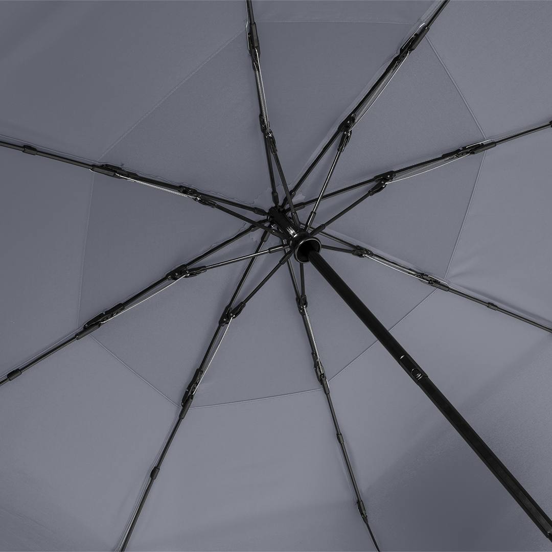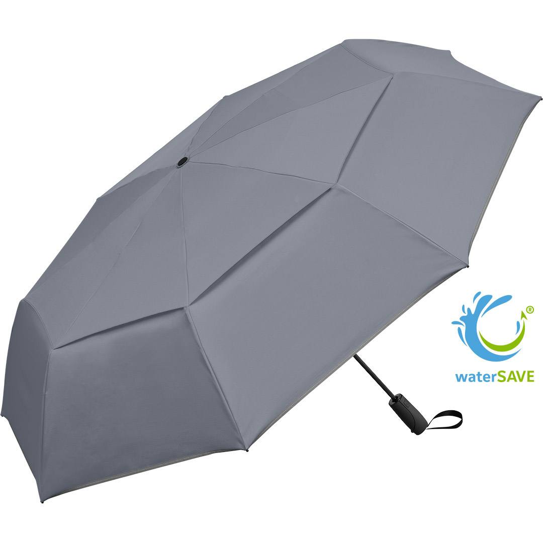 Convenient automatic open/close function for quick opening and closing, high-quality Windproof PLUS system for maximum frame flexibility in strong gusts of wind, flexible fibreglass ribs, Overlapping ventilation cover to regulate excess pressure from strong gusts of wind, water-saving polyester pongee waterSAVE® cover material made from recycled plastics and with fashionable reflective piping in silver, with waterSAVE® label on the closing strap, handle made from recycled ABS with integrated push-button and promotional labelling option, comfortable sleeve with high-quality zip, hospitable large diameter