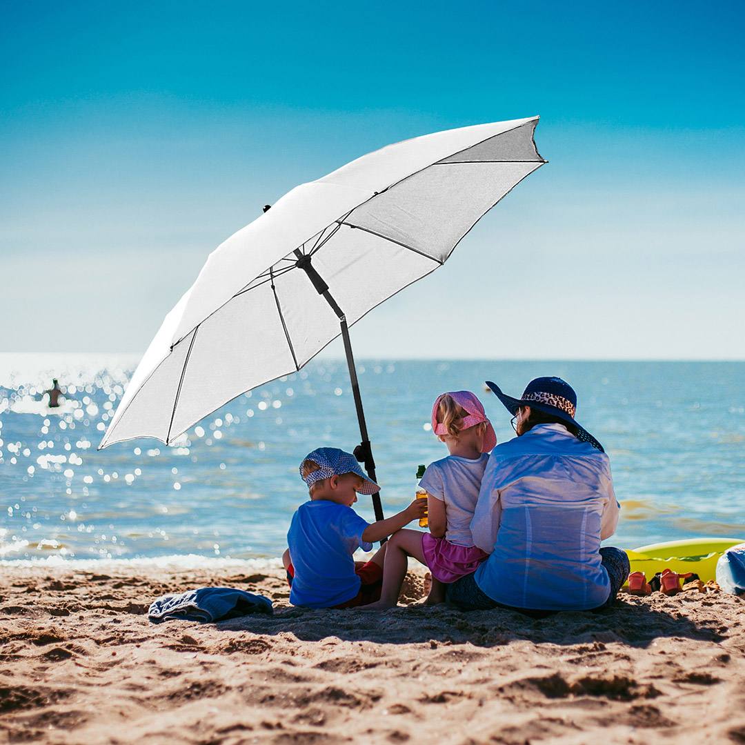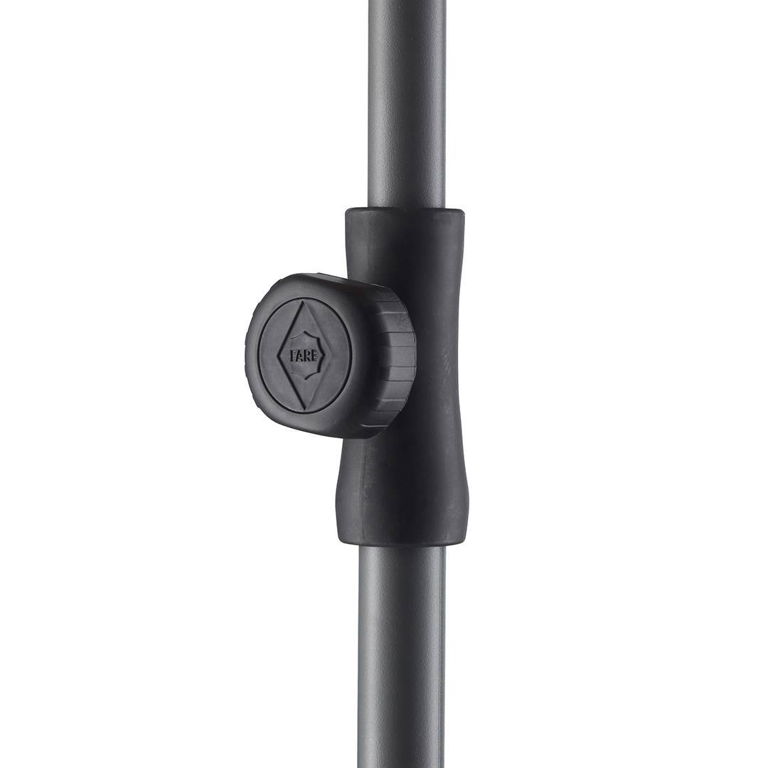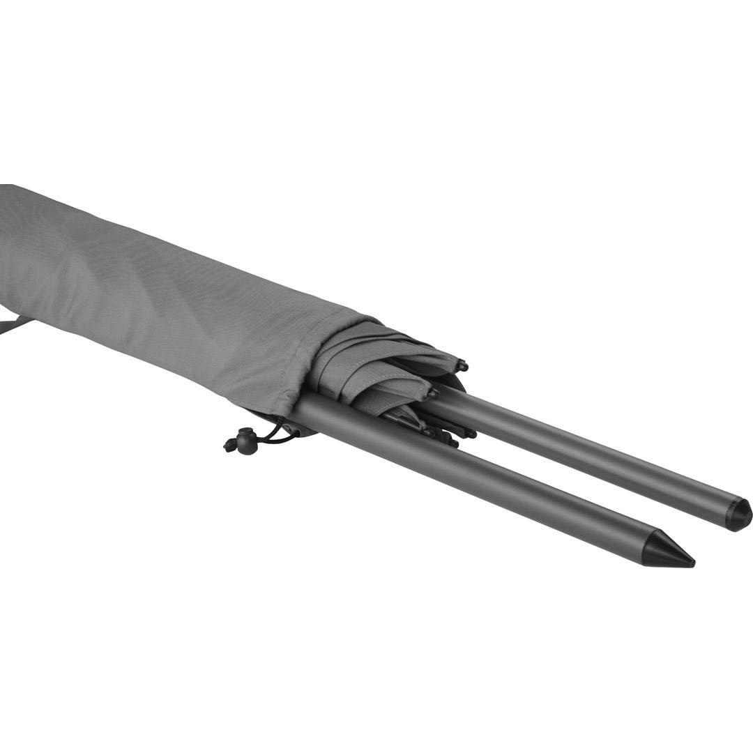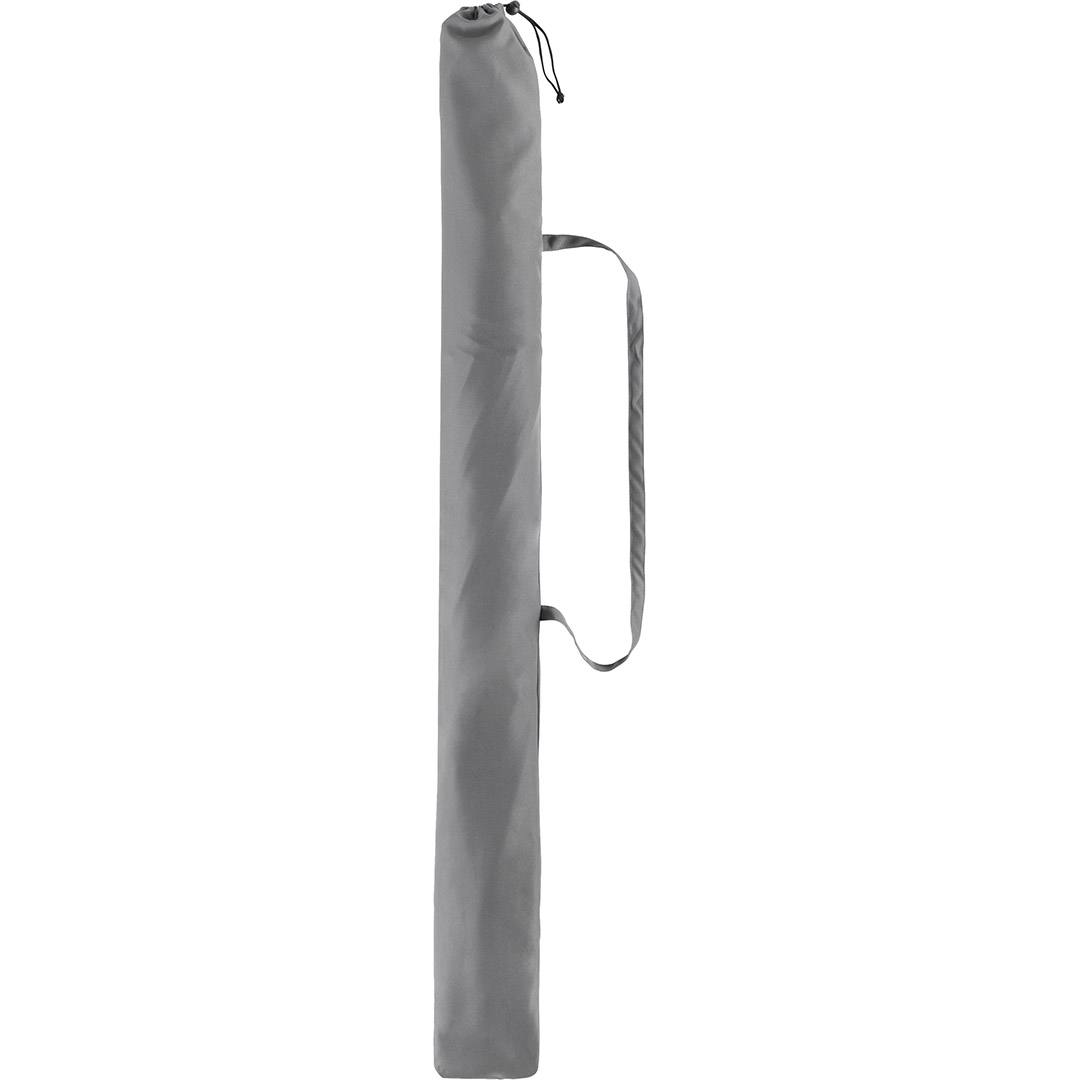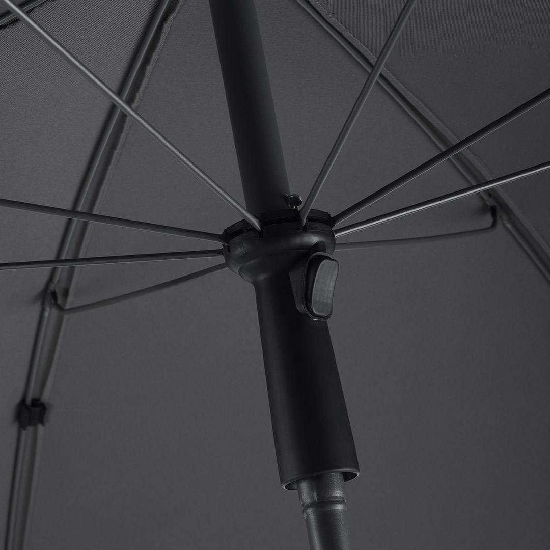 Simple handling with safety runner, solid and sturdy ribs, two-piece and progressively height-adjustable shaft with tilt mechanism to angle the umbrella, ribs and shaft in an elegant titanium finish, lower shaft approx. 120 cm long and twist lock to fix securely, closing strap, convenient carrying case, Cover with sun protection factor UPF 50+, excluding parasol base (Art. 8900)