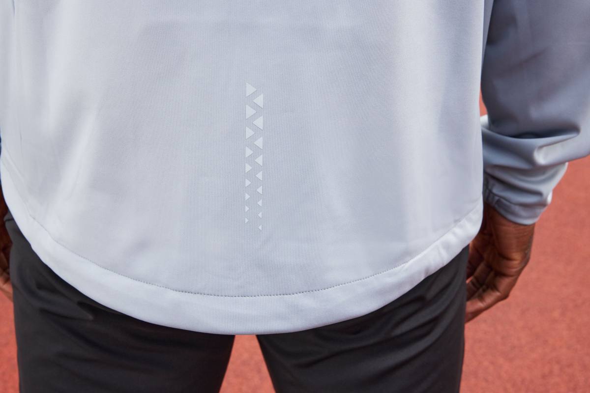 Reflective print at the back above the hem seam and on the forward shoulder seam at the front (no PPE)